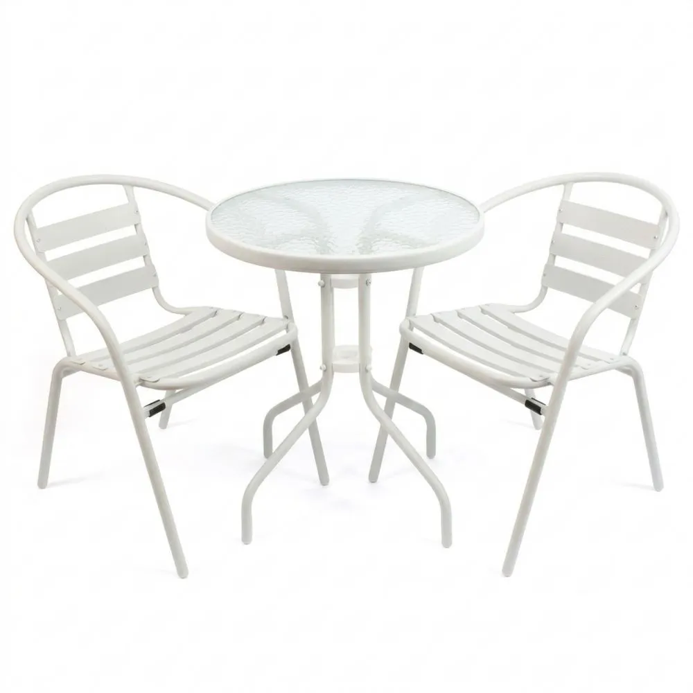 Este conjunto de jardín está diseñado para disfrutar del aire libre mientras se decora con estilo. Fabricado con estructura de metal para mayor resistencia. Su diseño sencillo se adapta a cualquier estilo decorativo. Adecuado para jardín, terraza o patio. Las dimensiones de la mesa son: Alto 70 cm x Largo 60 cm x Ancho 60 cm, y las de las sillas: Alto 30" x Largo 22" x Ancho 48 cm. Las sillas tienen reposabrazos gruesos y respaldo rígido. La superficie de la mesa es de vidrio texturizado. Se recomienda el uso de un paño húmedo para su mantenimiento.